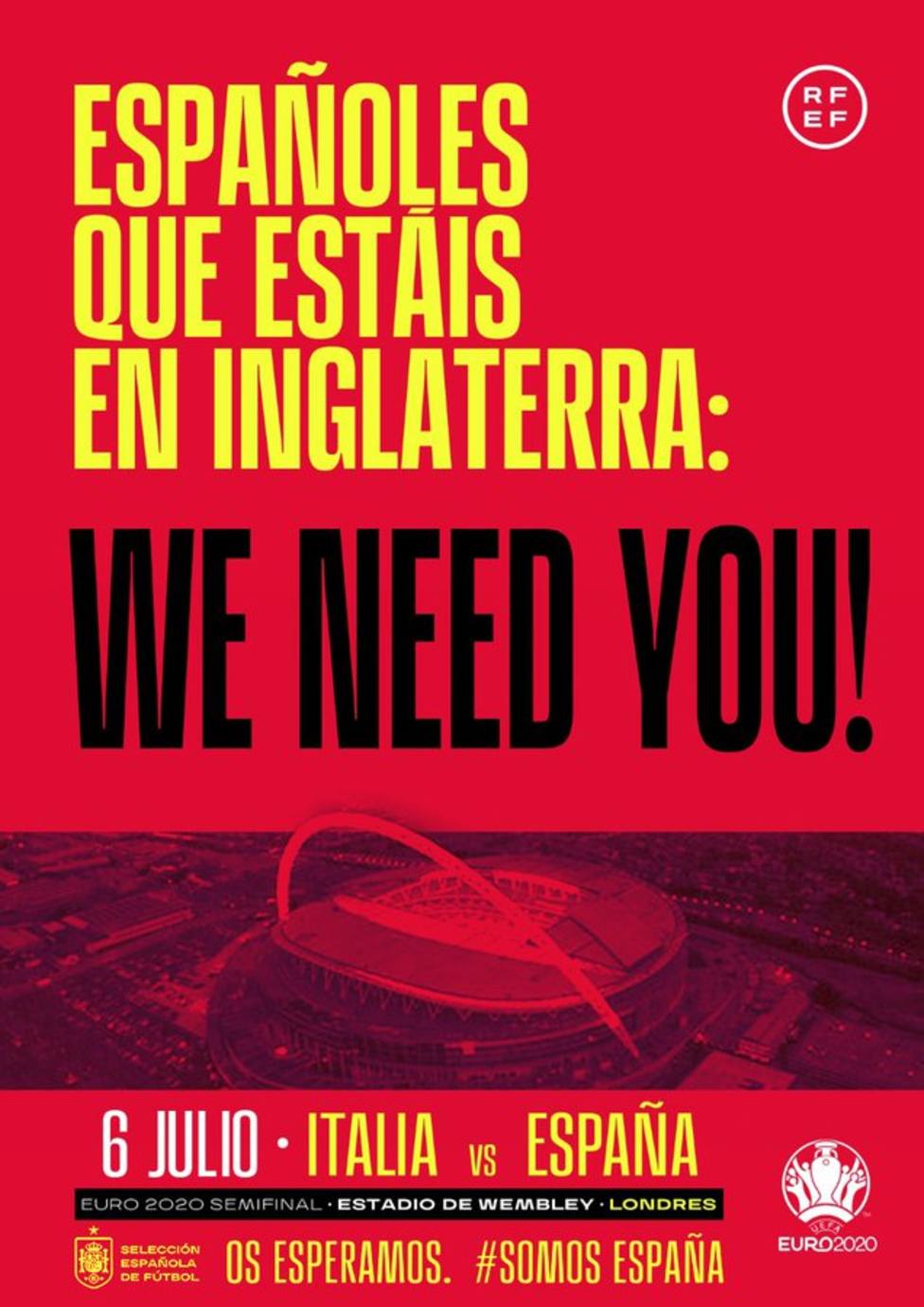 “Desde la RFEF, se es muy consciente de la gran cantidad de españoles que residen en Reino Unido, y sobre todo en su capital, Londres, escenario del encuentro. Es más importante que nunca que todos los que puedan, den su aliento y ánimo a España en un momento tan importante y en un partido que decide el pase a la gran final en esta Eurocopa”, asegura la institución.