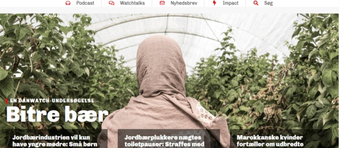 “Las fresas españolas que se venden en SuperBrugsen, Irma, Føtex y Netto son recolectadas por trabajadores que diariamente son sometidos a humillaciones y condiciones de trabajo que se califican de inhumanas, abusivas y, en muchos casos, ilegales», asegura el galardonado medio de investigación, que durante el mes de mayo de este año desplazó un equipo hasta la provincia de Huelva para conocer de primera mano la situación de las trabajadoras del campo onubense.