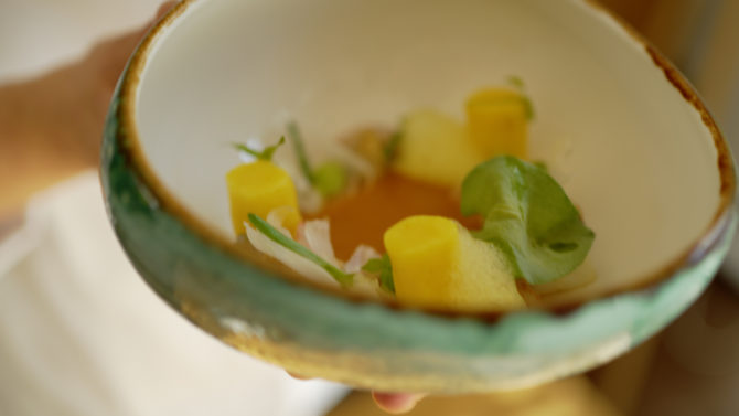 Entre sus propuestas gastronómicas, elaboradas junto con Summa para sus cartas de verano, hay que destacar platos como la quisquilla de Cartagena con toques de su huerta, costillar a baja temperatura, crema de mariscos al palo cortado, caballa ahumada con crema ligera de berenjena, sopa de parmesano, cítricos y huevas de trucha o arroz de alcachofas y ajos tiernos con calamar de playa.