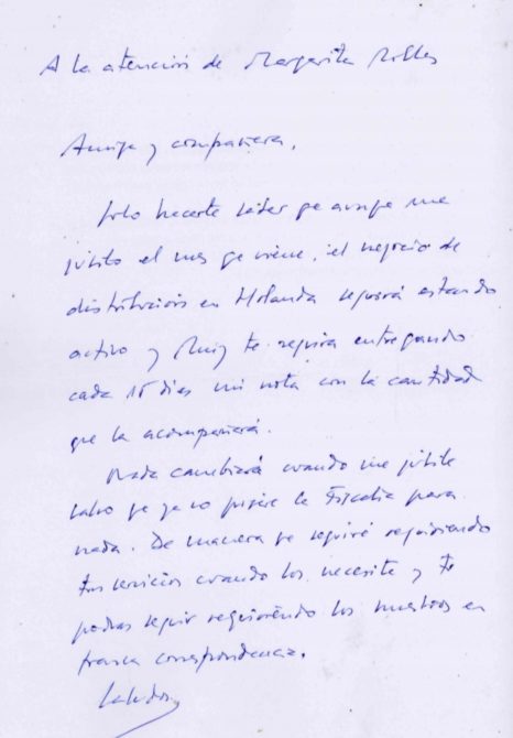 Solo hacerte saber que aunque me jubilo el mes que viene, el negocio de distribución en Holanda seguirá estando activo y Ruíz te seguirá entregando cada 15 días mi nota con la cantidad que la acompaña.