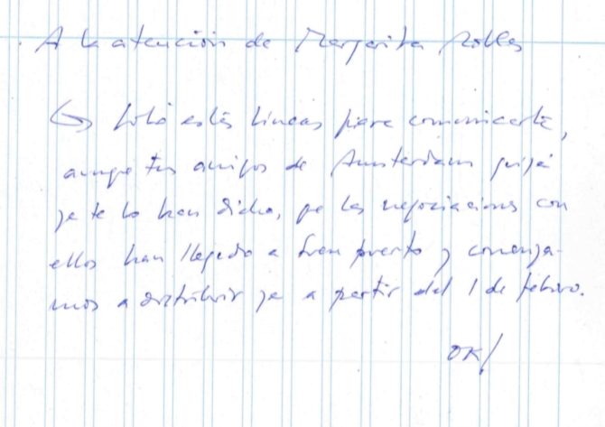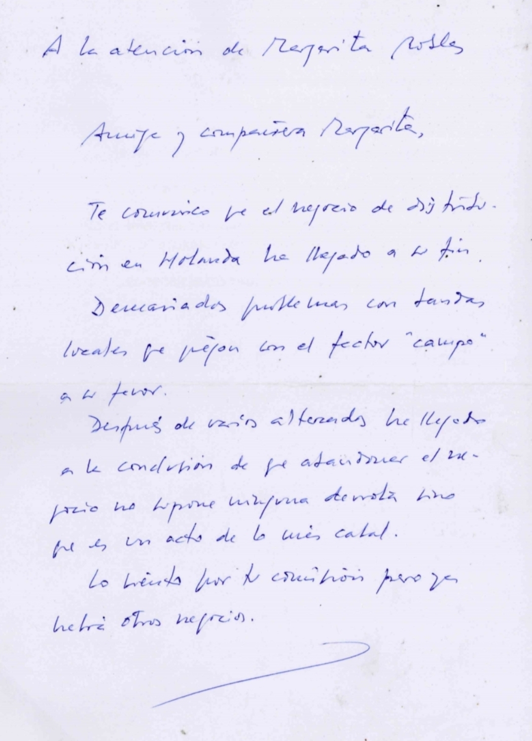 Solo hacerte saber que aunque me jubilo el mes que viene, el negocio de distribución en Holanda seguirá estando activo y Ruíz te seguirá entregando cada 15 días mi nota con la cantidad que la acompaña.