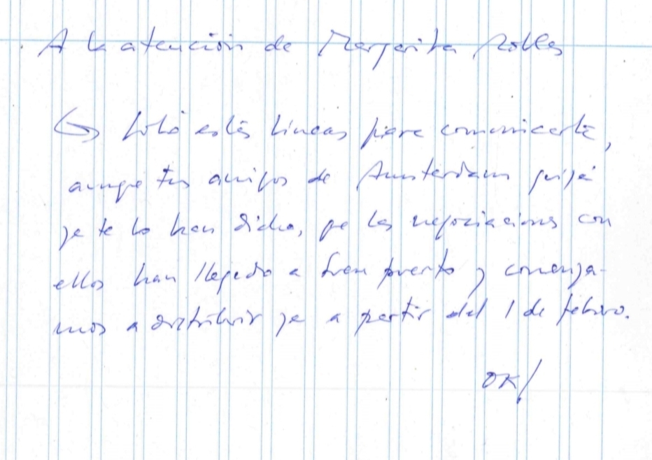 Solo estas líneas para comunicarte, aunque tus amigos de Ámsterdam quizás ya te lo han dicho, que las negociaciones con ellos han llegado a buen puerto y comenzamos ya a partir del 1 de febrero.