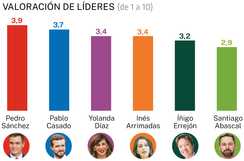 Si bien ninguno de los representantes de los principales partidos aprueba el examen, Abascal cuenta con tan solo un 2,9. Según este barómetro, el más apreciado por la ciudadanía sería el presidente del Gobierno, Pedro Sánchez, quien –dentro de este suspenso general– es puntuado con un 3,9. Le sigue de cerca el presidente de la oposición, Pablo Casado. El líder de los populares se encuentra a dos décimas del líder del Ejecutivo y, según la encuesta, rozaría la mayoría con Vox.