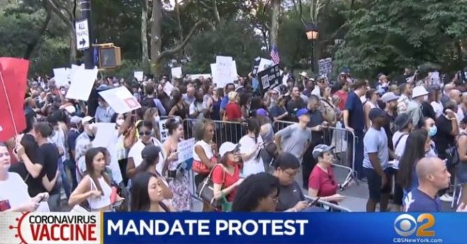 El 25 de agosto, miles de neoyorquinos se manifestaron frente al edificio municipal para expresar su oposición a las vacunas obligatorias, muchos de ellos eran empleados estatales, docentes, operarios de trenes y padres que expresaron su voluntad de dejar el trabajo antes que ponerse la vacuna.
