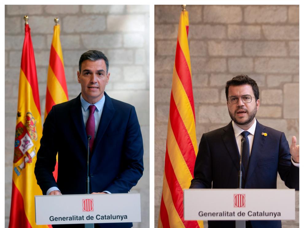 El presidente del Gobierno, Pedro Sánchez, y el de Cataluña, Pere Aragonès, han ofrecido ruedas de prensa consecutivas en el mismo lugar del Palacio de la Generalidad para dar cuenta de su reunión de este miércoles, si bien la escenografía ha variado de una comparecencia a otra, ya que el mandatario catalán ha decidido prescindir de la bandera española que figuraba junto a la catalana tras el atril.