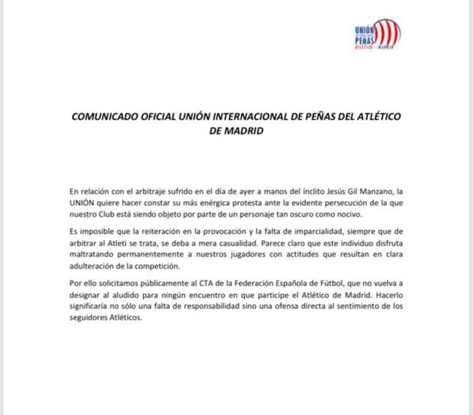 Termina el comunicado señalando que piden a la Federación que no les arbitre en más ocasiones: “Por ello solicitamos públicamente al CTA de la Federación Española de Fútbol, que no vuelva a designar al aludido para ningún encuentro en que participe el Atlético de Madrid. Hacerlo significaría no sólo una falta de responsabilidad sino una ofensa directa al sentimiento de los seguidores Atléticos”.