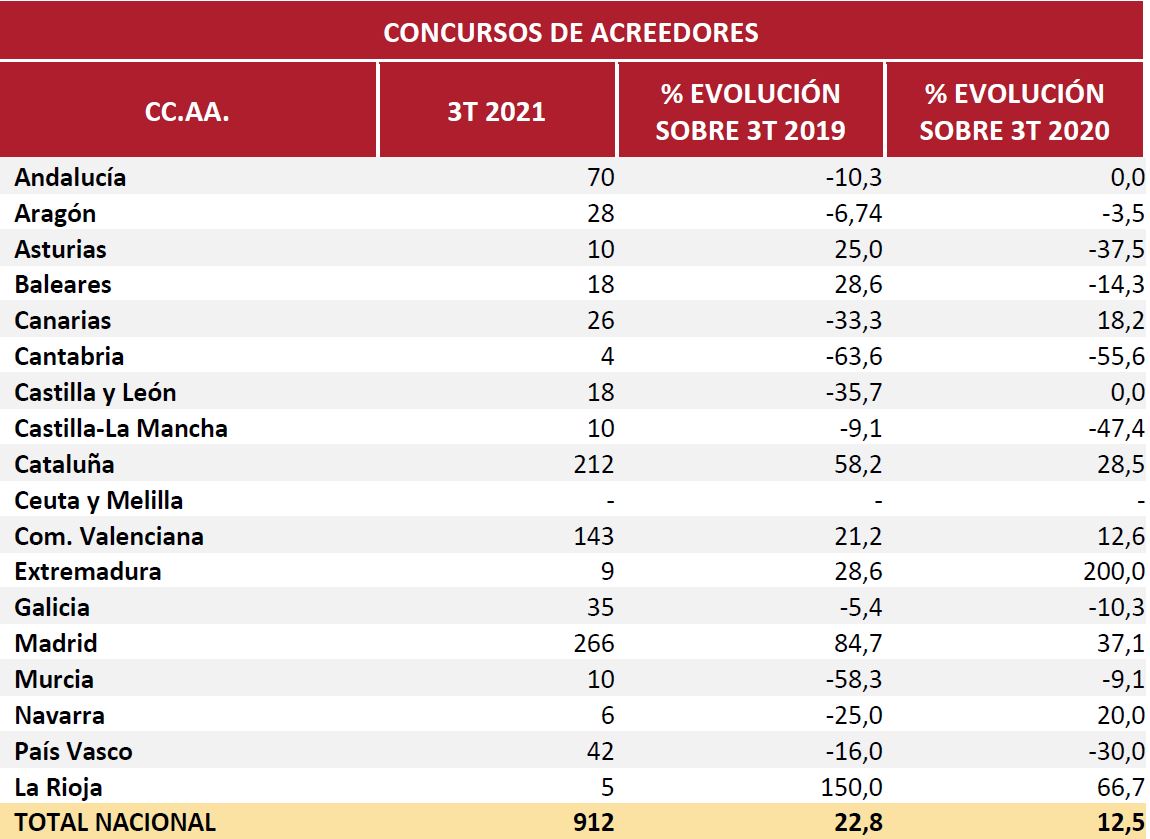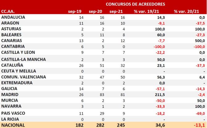 En datos anualizados, en los últimos 12 meses, de octubre de 2020 a septiembre de 2021, se declararon en concurso 4.707 sociedades, un 45,9% más que en el acumulado del año anterior.