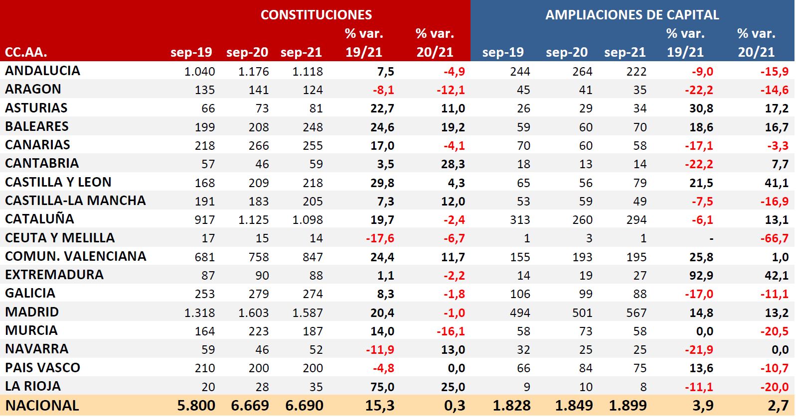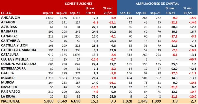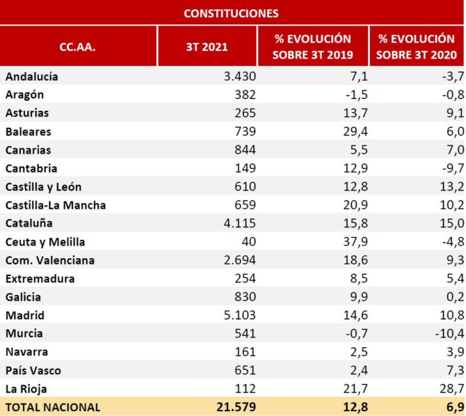 Los mayores descensos se producen en Murcia (-16,1 %) y Aragón (-12,1 %). Los mismos datos comparados con septiembre de 2019, período correspondiente anterior a la pandemia, muestran un aumento de constituciones en catorce comuniaddes, obteniendo un 15,3 % de aumento a nivel nacional.