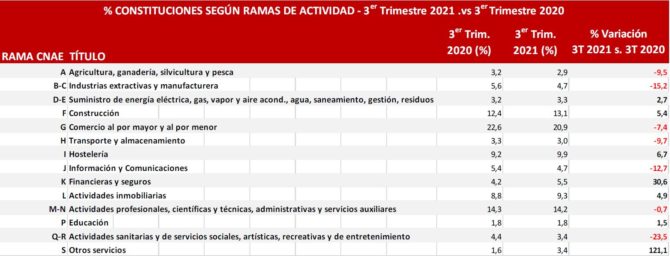 En cuanto a las constituciones, en septiembre se observa un ligero incremento del 0,3 % respecto al mismo mes de 2020.