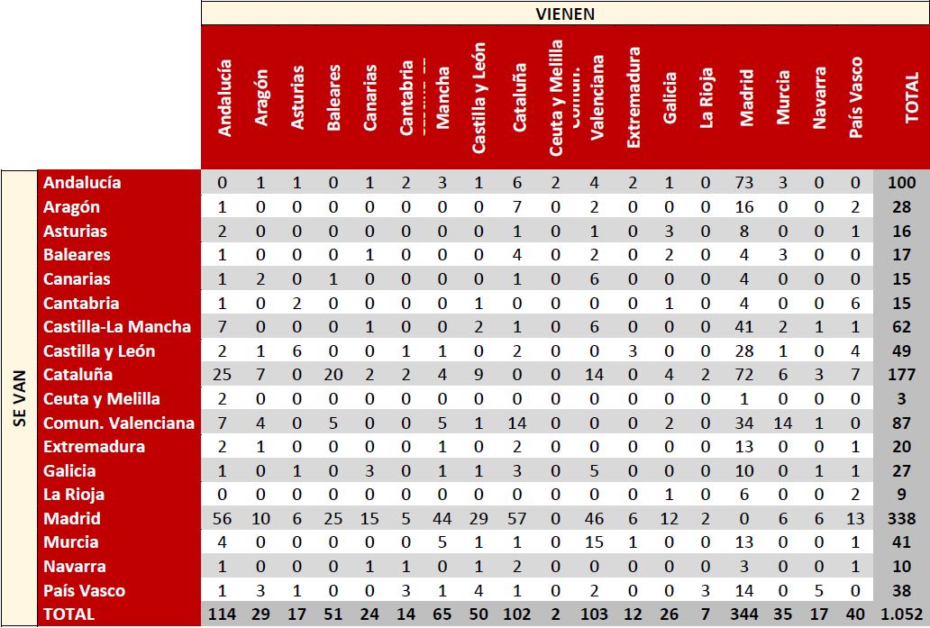 Entre las comunidades de las que se van, destaca Madrid, con 338 salidas, seguido de Cataluña, 177, Andalucía, 100 y Comunidad Valenciana con 87.