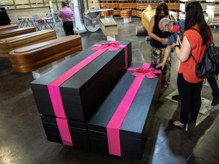 Los ataúdes que se pueden ver en esa producción de la plataforma Netflix, uno de los fenómenos audiovisuales del año, tienen también su hueco desde este miércoles en Feria Valencia y sus característicos lazos rosas destacan en el expositor de la firma valenciana Arcae.