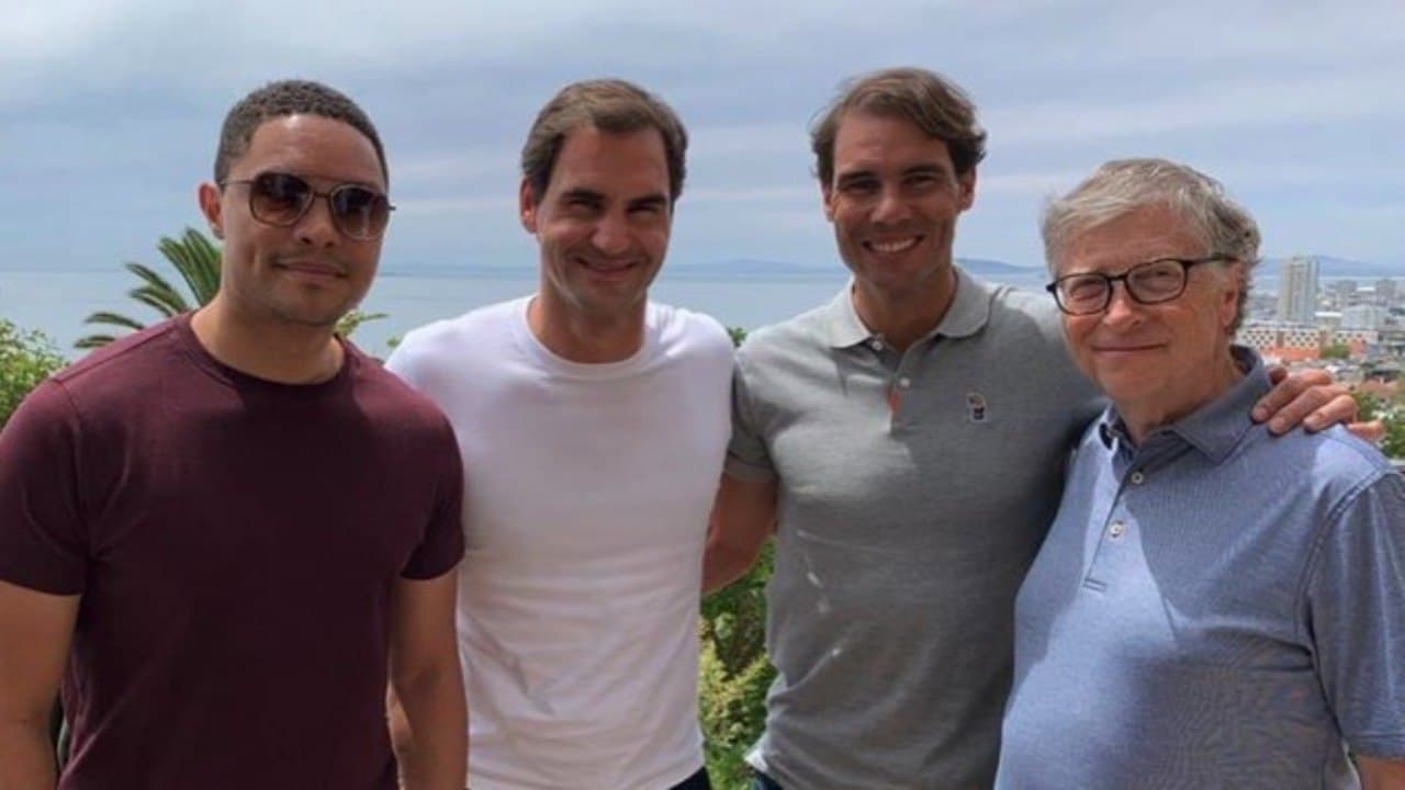 Tenía ya el artículo casi acabado, cuando por las redes me llegaron unas imágenes que, más que helarme la sangre en las venas, me parecieron campanillazos del Espíritu Santo, serendipias venidas de otras dimensiones: resulta que en una imagen se veía a Nadalete, a Federer a su lado, y a la izquierda de Nadal se veía a… sí, a ése: ¡Bill Gates! Bingo cósmico. Y el INRI fue también cósmico, pues a esa imagen siguieron otras del mismo cuño.