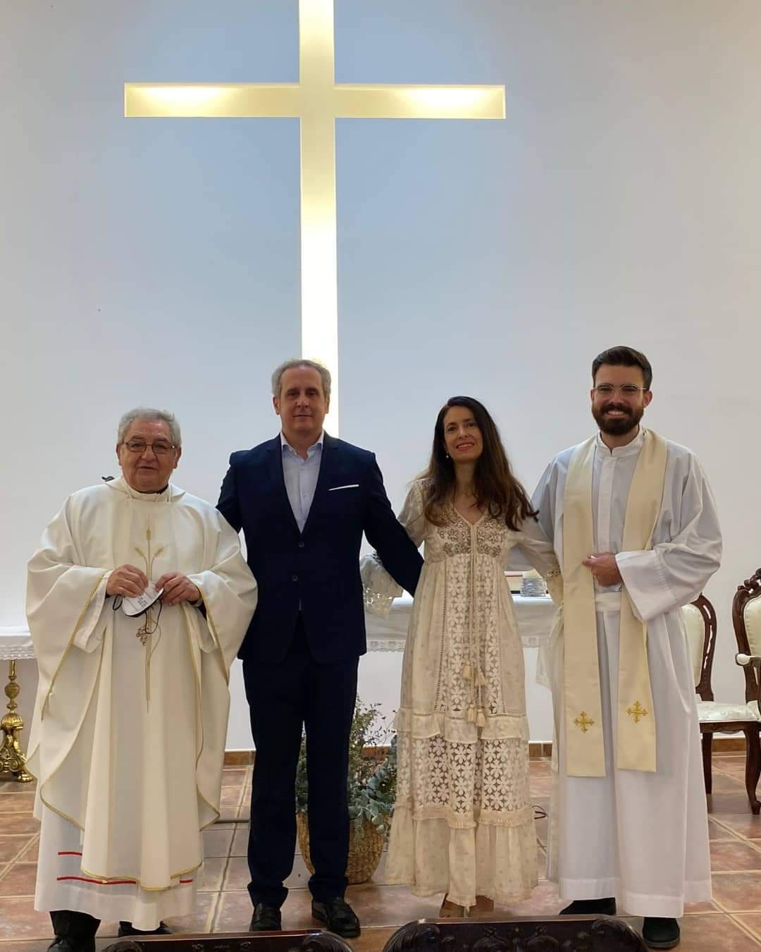 Sonia Crespo y Antonio Gallego, junto a los dos sacerdotes que oficiaron la ceremonia religiosa.Es Sonia Crespo una periodista elegante, culta y tranquila y también una de las personas más serias, honorables y consecuentes con los que ha contado Vox en Málaga. Ex responsable de Comunicación del partido de Abascal en la provincia, Sonia Crespo dimitió de su cargo y abandonó el partido, entre otros motivos, por el boicot decretado por la dirección provincial a este medio, una decisión a la que siempre se opuso.
