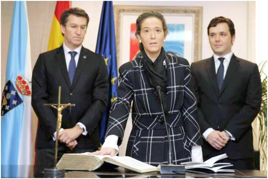 La secretaria xeral de medios, Mar Sánchez Sierra, querellante, cuando juró su cargo; a la izquierda el presidente de la Xunta, Alberto Núñez Feijóo; y a la derecha el director xeral de comunicación, Lucas Martinón-Torres. Foto: Xunta de Galicia.