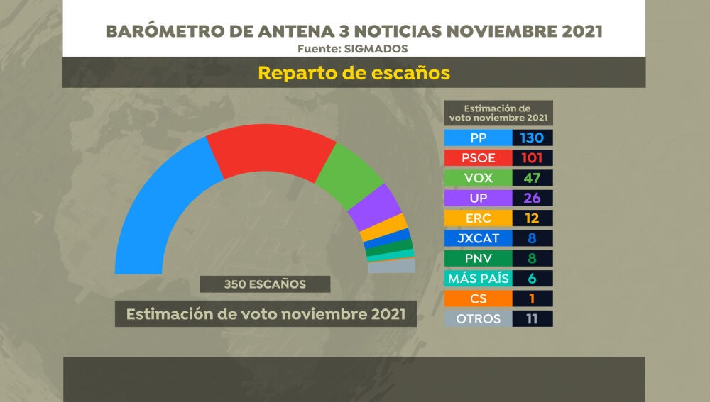 El Partido Popular mantiene los resultados del anterior barómetro y lograría mayoría absoluta con el apoyo de Vox, que llegaría a los 47 diputados. Son los datos que refleja la encuesta electoral de Sigma 2 para Antena 3 Noticias de este mes de noviembre. Por su parte, el PSOE recupera un escaño y Unidas Podemos suma dos más para llegar a los 26.