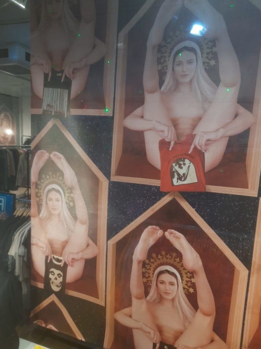AD. En la tarde del día de ayer, tres piadosas mujeres se personaron en la tienda de camisetas sita en la calle de Jaime I, numero 11 de la ciudad Condal, a cuatro pasos de la plaza del Ayuntamiento y el palacio de la Generalidad de Cataluña. Las señoras, escandalizadas por tres carteles blasfemos que hacían escarnio sexual de la madre de Dios, exigieron a la dependienta su retirada inmediata, a lo cual se negó de malos modos conminándolas a gritos a abandonar la dependencia.