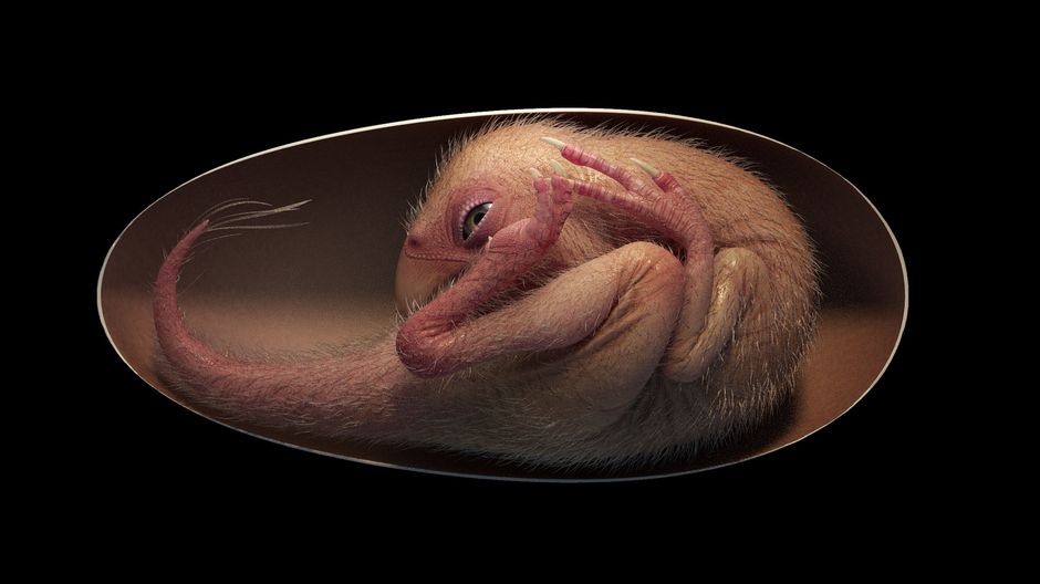 El espécimen “semeja exactamente un polluelo enrollado en su huevo, lo que aporta una prueba adicional que las numerosas características de las aves actuales derivan de sus ancestros dinosaurios”, agregó.