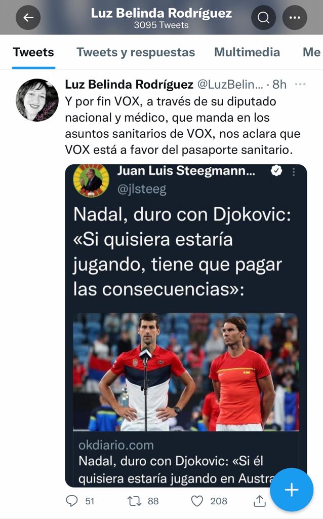 Steegman ha defendido sañudamente la agenda covidiana en declaraciones y tuits. Ahora sin embargo ha traspasado todas las líneas rojas. En medio de la polémica internacional que ha provocado la retención del tenista serbio Novak Djokovic en Australia y las posteriores declaraciones de Rafa Nadal alineándose, no con su compañero, sino con las autoridades carceleras australianas, lo que ha generado una oleada de indignación contra el deportista balear, esto ha dejado escrito en Twitter el dirigente de Vox: “Nadal, duro con Djokovic. Si quisiera estaría jugando, tiene que pagar las consecuencias”.