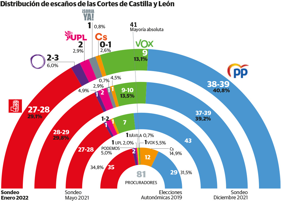 El Partido Popular obtendría más del 40% de los votos y se quedaría a tan solo 2 ó 3 escaños de la mayoría absoluta en las elecciones autonómicas del 13 de febrero en Castilla y León.