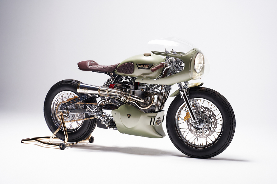 Finalmente, pero no por ello menos importante, un emblemático motor de una Thruxton 900 de carburación da vida a la pieza, que hará suspirar con su sonido a todos aquellos amantes de los estilos de motocicletas neoclásicas. El motor ha sido abierto y renovado por completo para conseguir uno totalmente nuevo.