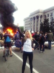 Esta es una foto de la lider de FEMEN celebrando ese incendio provocado por sus seguidores al grito de “muerte a los rusos!”, el que se relata de primera mano en el articulo de ese enlace que he dejado y en el que fallecieron calcinados mas de 50 inocentes, incluyendo menores, a los que saltaban por las ventanas huyendo del fuego los remataban en la calle con barras de hierro