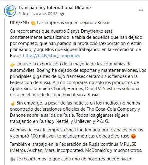 Algunas empresas occidentales intentaron resistir estas medidas, pero terminaron rindiéndose a las presiones, como el caso de Coca-Cola y PepsiCo. ¿De dónde han venido estas presiones para cesar las operaciones en Rusia? En buena parte de la publicidad negativa que viene realizando la ONG “Transparency International”.
