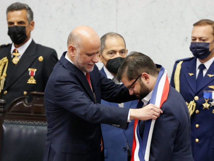 En el Salón de Honor del Senado, el nuevo presidente de la cámara, el socialista Álvaro Elizalde, le impuso la banda presidencial a Boric, que con apenas 36 años y un mes se convierte en el mandatario más joven de la historia del país.
