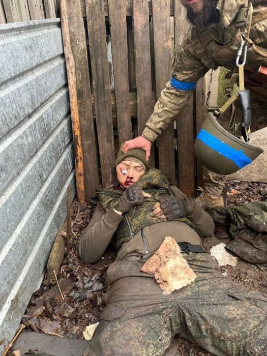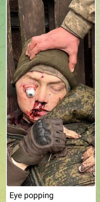 Nunca como en este conflicto la mentira se había convertido en un arma de guerra tan poderosa. La narrativa oficial nos habla de supuestos crímenes del bando ruso, muchas de ellas refutadas como falsas, y sin embargo se oculta las atrocidades que están cometiendo los combatientes ucranazis contra prisioneros de guerra rusos. En la imagen una de esas víctimas, golpeado hasta la muerte y sin que su muerte remueva conciencias entre nuestros mandatarios. En una exhibición de máximo sadismo, los ucranazis arrancaron los ojos al prisionero, no sabemos si antes o después de su fallecimiento.