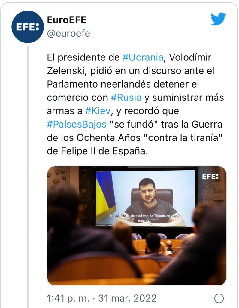 Traducido del inglés al español, parece que EFE había hecho correctamente su trabajo. “Sé que mañana vuestro país celebrará 450 años desde el inicio del levantamiento armado en contra de la tiranía”, expuso Zelenski en referencia a la Guerra de los 80 Años que comenzó en la segunda mitad del siglo XVI entre las Diecisiete Provincias de los Países Bajos contra el rey Felipe II, quizás uno de los monarcas más admirados de la historia de España por convertirla en la primera potencia de Europa y lograr que el Imperio español se extendiera por todos y cada uno de los continentes habitados del mundo.