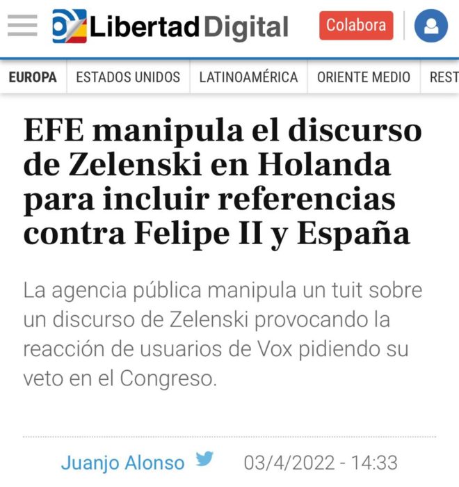 Libertad Digital se alinea con Vox al acusar falsamente a la agencia EFE de tergiversar “el discurso de Zelenski en Holanda” en el que tildaba de “tiranía” a la España de Felipe II