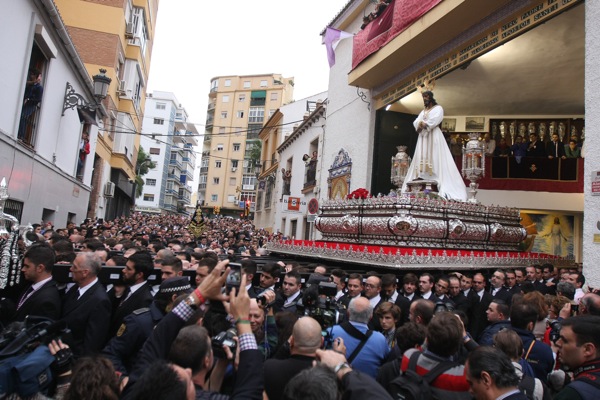 Tras el rezo pertinente, con especial atención a Manuel Montero, consejero de la hermandad y mayordomo de trono, fallecido recientemente, comenzaron los vivas al Cautivo y la Trinidad antes de que saliese el trono, que maniobró a los sones de la marcha Cautivo dejando la cabeza de varal a 20 centímetros de la pared. Los aplausos, vivas y las lágrimas de emoción ante el Señor de Málaga invadieron la calle como un escalofrío que se extendía entre las filas de nazarenos y el público.
