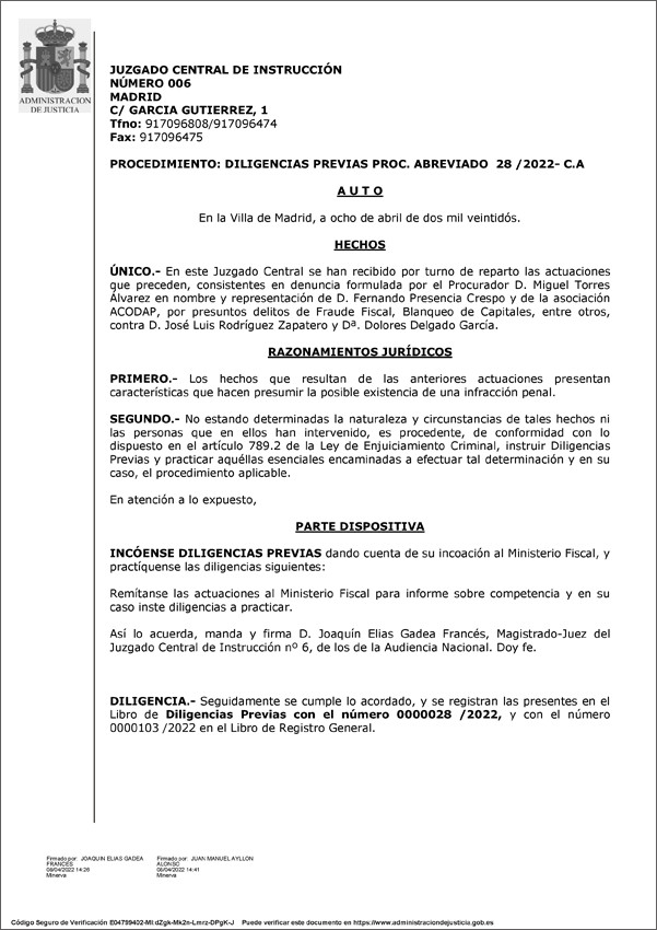 ECS.- El juzgado central de instrucción número 6 de Madrid notifica mediante un auto público la apertura de diligencias contra el ex presidente español Rodríguez Zapatero por los delitos de blanqueo de capitales, evasión y fraude fiscal por valor de 3 millones de euros depositados en una cuenta en Panamá. En el auto también se imputa a la actual fiscal general del estado, Dolores Delgado. Con este auto, la Audiencia Nacional iniciará las investigaciones penales.