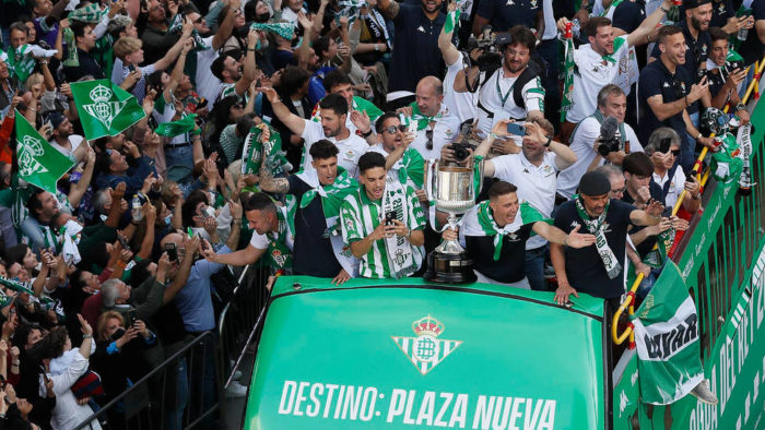 Miles de béticos inundaron en la tarde de este domingo las calles de Sevilla para ver el paseo triunfal de su equipo con el trofeo de campeón de la Copa del Rey logrado en la noche del sábado en el Estadio La Cartuja ante el Valencia, al que superó en la tanda de penaltis tras acabar el partido y su prórroga con empate a uno.
