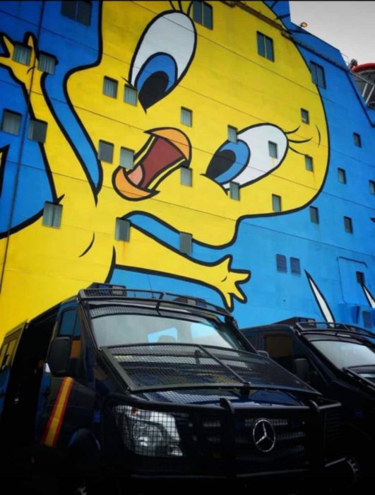 Sin duda un muelle de inflamables en el puerto, cargado de almacenes de productos químicos y depósitos de gas no parecía el lugar ideal para atracar un barco para alojar a cientos de policías, por cierto un barco con tripulación italiana de escaso castellano y sobrada mala educación (¿Dónde estaban las navieras españolas? De perfil). No obstante la moral era alta y las ganas de neutralizar el referéndum separatista eran tan inflamables como aquellos depósitos que nos rodeaban.