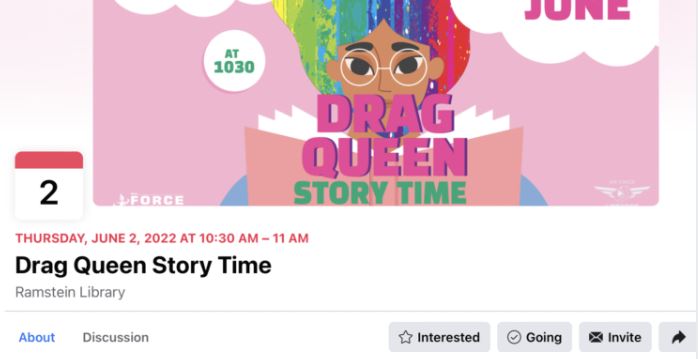 “¡Celebramos el Mes del Orgullo en la Biblioteca de Ramstein con la hora del cuento Drag Queen! ¡Únete a nosotros con la lectora invitada especial Stacey Teed! Asegúrate de llevar tus trajes más brillantes y coloridos!”, dice el anuncio del evento en Facebook, que fue publicado por la página de las Bibliotecas de la Fuerza Aérea de Ramstein y Vogelweh.