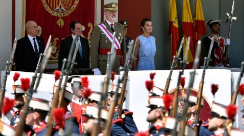 Desde los balcones más próximos a la tribuna presidencial han sido numerosos los aplausos y vítores a don Felipe y doña Letizia, entre los que se han mezclado aislados reproches a la ministra de Defensa, Margarita Robles, e incluso una alusión a la exdirectora del CNI, Paz Esteban, destituida recientemente por el ‘caso Pegasus’.