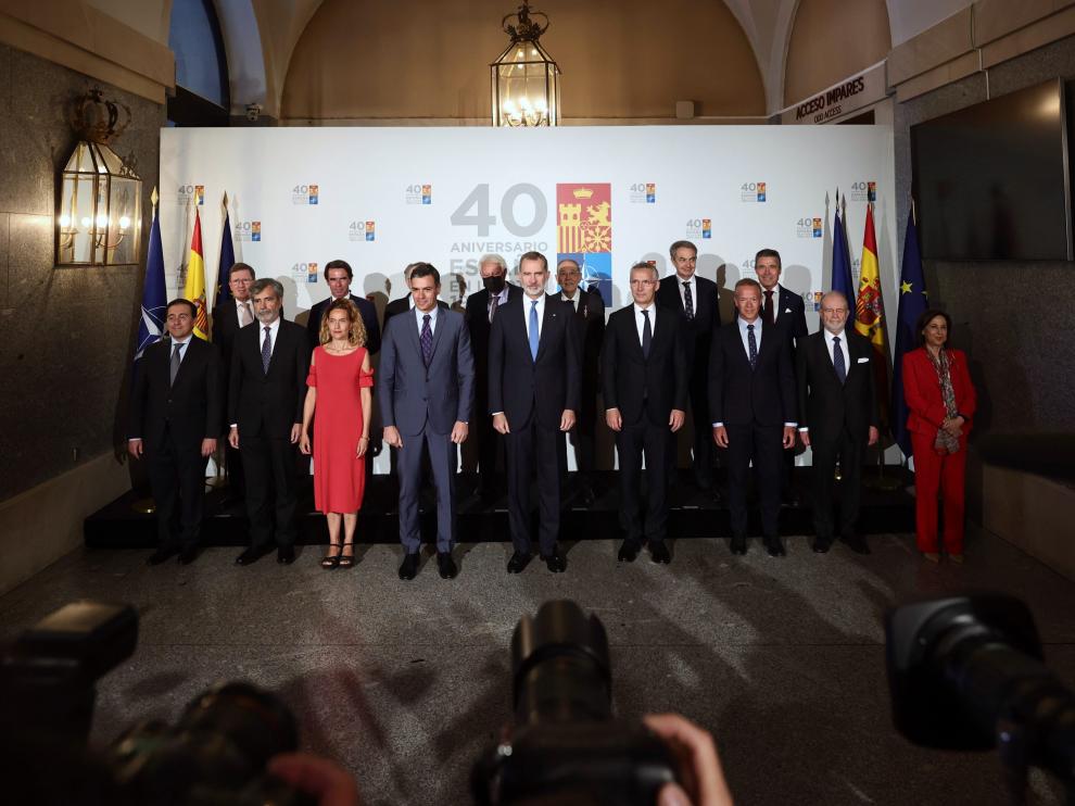 Felipe VI ha lanzado este mensaje durante su discurso de clausura del acto de conmemoración del 40 aniversario de la adhesión de España a la Alianza Atlántica que se celebra este lunes en Madrid en presencia del secretario general de la OTAN, Jens Stoltenberg, así como sus antecesores, además del presidente del Gobierno, Pedro Sánchez, los expresidentes españoles –excepto Mariano Rajoy– y una parte importante de miembros del Ejecutivo, aunque solo ministros del PSOE.