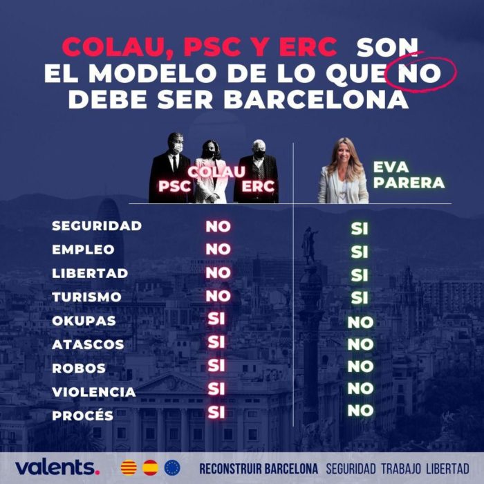 Eva Parera, presidenta de Valents y candidata a la alcaldía de Barcelona ha manifestado que “el tripartito de la miseria dice no a la seguridad, al empleo y a la libertad, pero sí quieren okupas, atascos, robos, violencia y procés”.