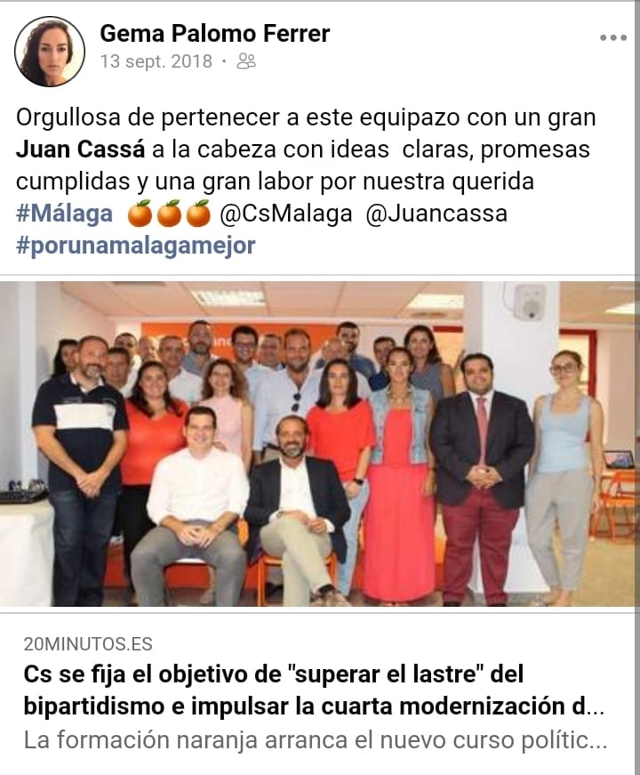 El hecho de que Gema Palomo no se haya molestado en borrar fotos en las que aparece posando, aplaudiendo y deseándole infinitos éxitos al impresentable de Juan Cassá (concejal y diputado provincial sin responsabilidades que se embolsa cerca de 100.000 euros anuales) evidencia, además una incapacidad manifiesta del presidente de la Gestora de VOX Málaga, Antonio Sevilla, para “gestionar” absolutamente nada.