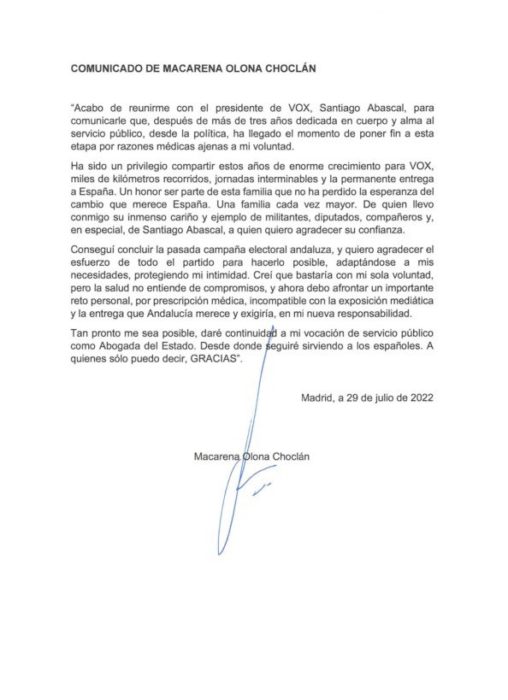 “Conseguí concluir –añade Olona– la pasada campaña electoral andaluza, y quiero agradecer el esfuerzo de todo el partido para hacerlo posible, adaptándose a mis necesidades, protegiendo mi intimidad. Creí que bastaría con mi sola voluntad, pero la salud no entiende de compromisos y ahora debo afrontar un importante reto personal, por prescripción médica, incompatible con la exposición mediática y la entrega que Andalucía merece y exigiría, en mi nueva responsabilidad. Tan pronto como me sea posible, daré continuidad a mi vocación de servicio público como abogada del Estado. Desde donde seguiré sirviendo a los españoles”.