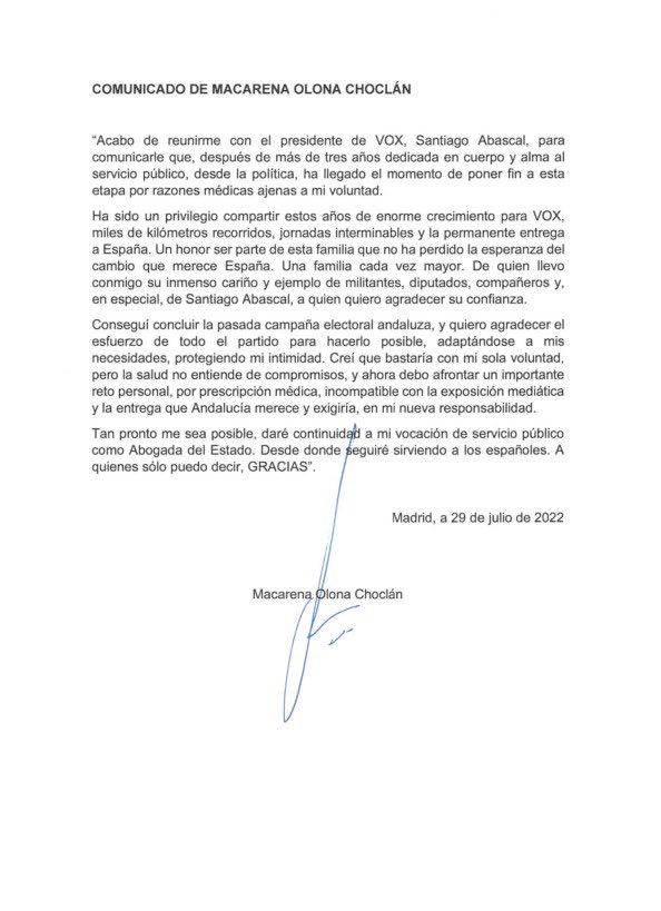 En la nota, Olona añade: “Ha sido un privilegio compartir estos años de enorme crecimiento para Vox, miles de kilómetros recorridos, jornadas interminables y la permanente entrega a España. Un honor ser parte de esta familia que no ha perdido la esperanza del cambio que merece España. Una familia cada vez mayor. De quien llevo conmigo su inmenso cariño y ejemplo de militantes, diputados, compañeros y, en especial, de Santiago Abascal, a quien quiero agradecer su confianza”.