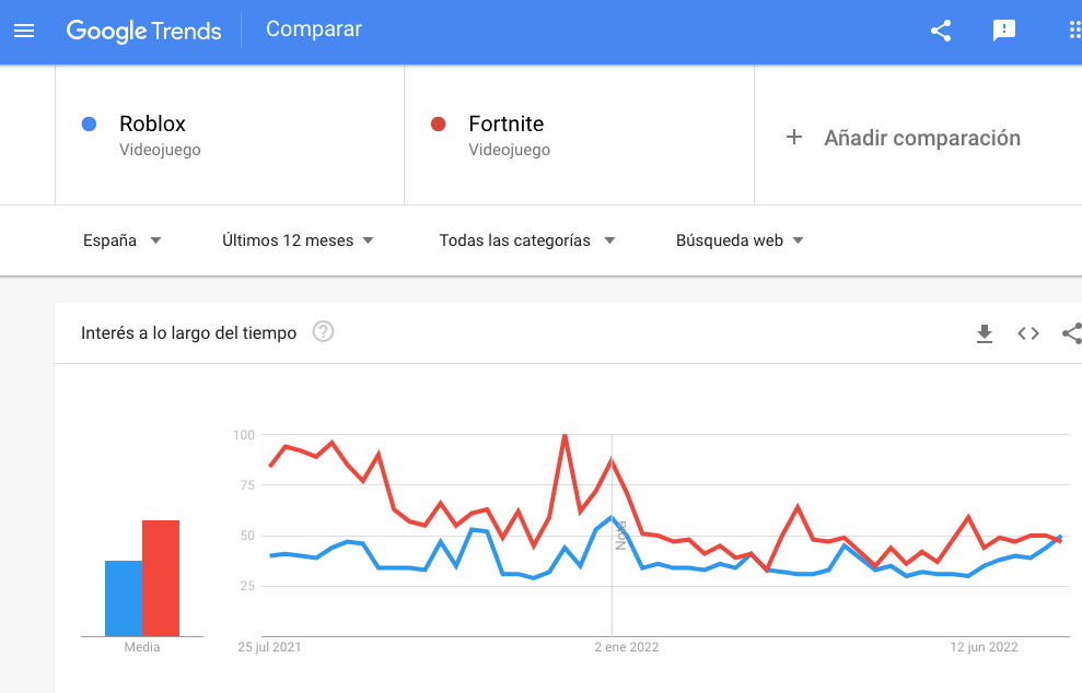 Esos son los datos que se pueden extraer de Google Trends atendiendo a las búsquedas de Roblox frente a las de Fortnite en España, en los últimos 12 meses, donde se refleja que por primera vez Roblox está por encima de Fortnite.