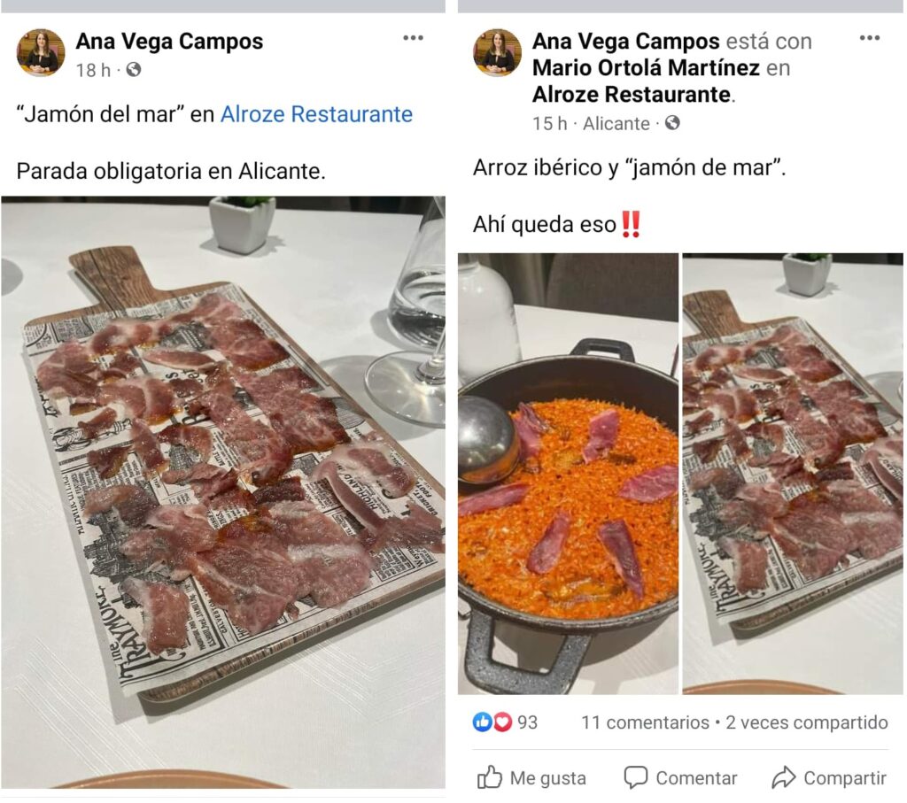No existen excusas para justificar que al menos Ana Vega, la presidenta de Vox en Alicante, no sustituyera a su concejal junto a las víctimas ocupando su papel de representante institucional. Una vez más, las redes sociales delataban que la síndica no tenía otros compromisos para esa tarde y aprovechaba sus vacaciones para disfrutar despreocupadamente junto a su marido, el concejal Mario Ortolá, de los manjares de un restáurate de lujo a solo 25 minutos del evento.
