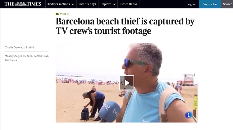 El diario británico The Times ha publicado una información sobre el robo en directo que captó un equipo de TVE en la playa de la Barceloneta el pasado fin de semana y destaca la “reputación” de la capital catalana en materia de hurtos.