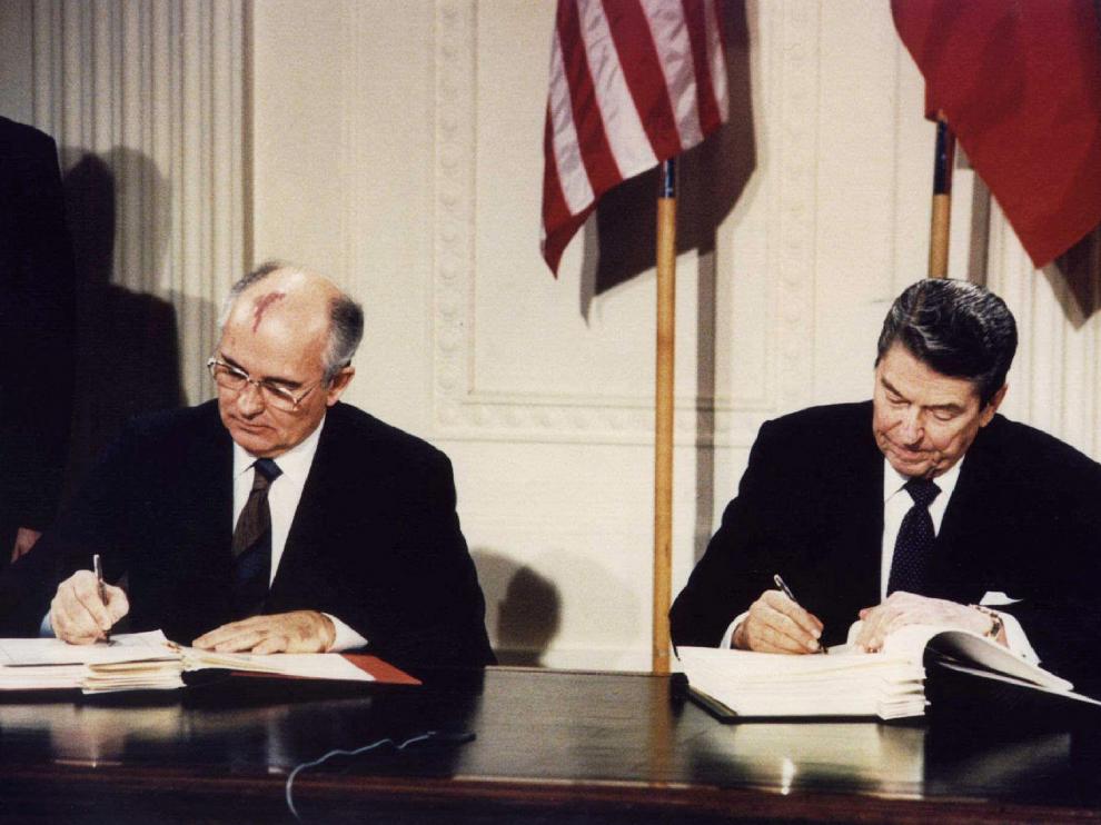 Ronald Reagan y Mijail Gorbachov firman el tratado sobre Fuerzas Nucleares de Alcance Intermedio en la Casa Blanca, el 8 de diciembre de 1987.