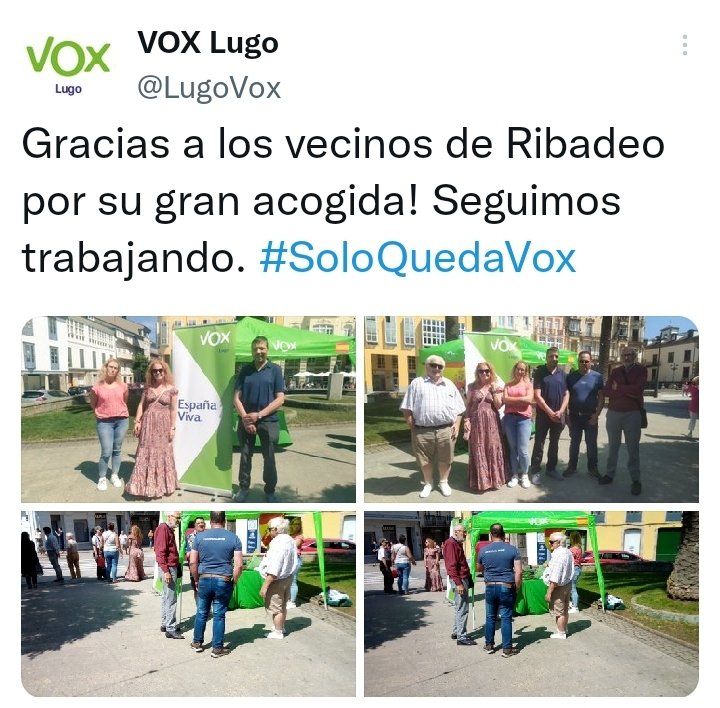 “Gracias a los vecinos de Ribadeo por la gran acogida. Seguimos trabajando”, han escrito en su perfil oficial de Twitter junto a cuatro instantáneas. En ellas se puede ver a varios miembros de la formación en esta población en una carpa verde con los logos de Vox. Lo que llama la atención es que, a diferencia de lo que celebran desde la cuenta del partido, no destaca la presencia de muchos habitantes junto a ellos.