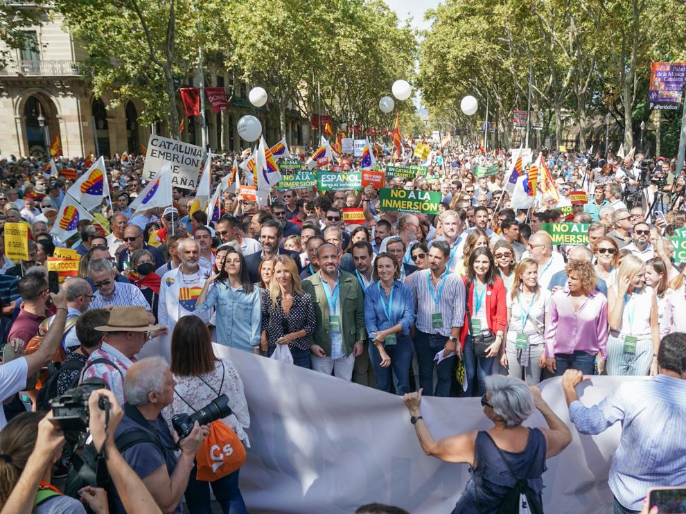 La manifestación ha reunido a dirigentes de PP, Cs, Vox y Valents, como la secretaria general del PP, Cuca Gamarra; el presidente de Vox, Santiago Abascal; la presidenta de Cs, Inés Arrimadas; la presidenta de Valents, Eva Parera; el líder de Cs en Cataluña, Carlos Carrizosa; el líder de Vox en Cataluña, Ignacio Garriga, y el líder del PP catalán, Alejandro Fernández.