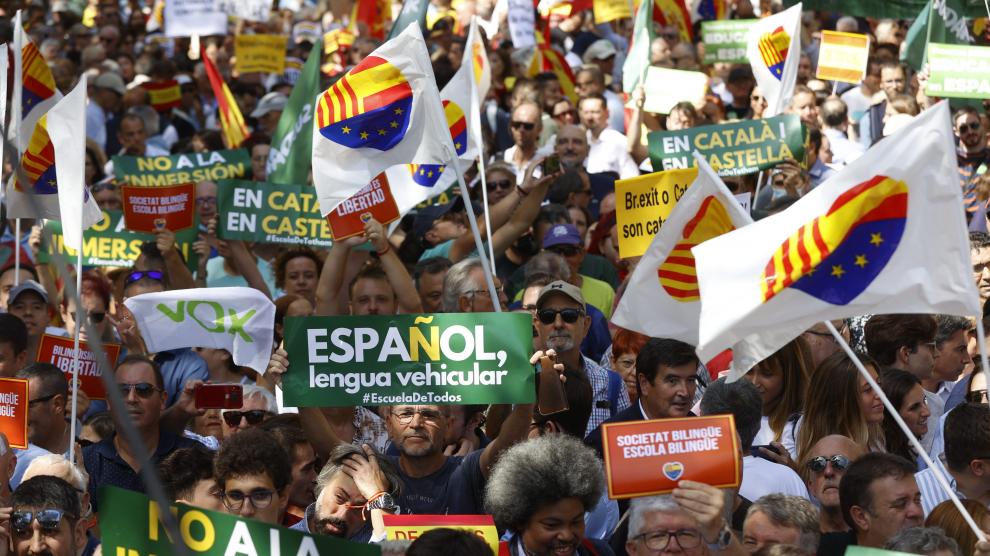 Muchos asistentes han ondeado banderas de España y otros han sostenido pancartas con mensajes como ‘Ni lengua ni doctrina impuestas’, ‘Cataluña es España’, ‘Prohibir un hablar es prohibir dialogar’, ‘Libertad’ y ‘Stop indoctrinating children in catalan schools’ (‘Basta de adoctrinar a los niños en las escuelas catalanas’), entre otros.