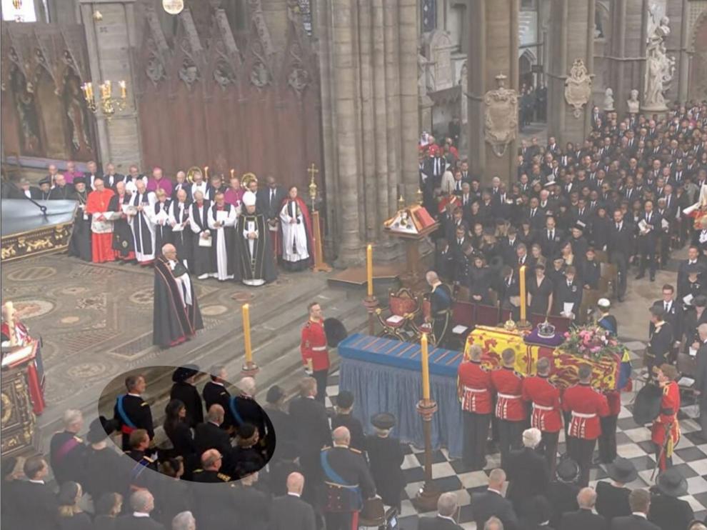 Los Reyes han sido sentados junto a los eméritos en el funeral de la reina Isabel II en la Abadía de Westminster en segunda fila y en una zona junto a otros miembros de otras casas reales.
