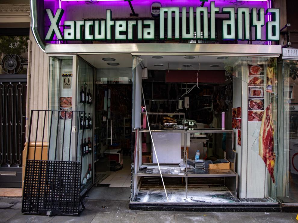 Desperfectos y cristales rotos el escaparate de una charcutería causados por los altercados en las Fiestas de la Mercé.